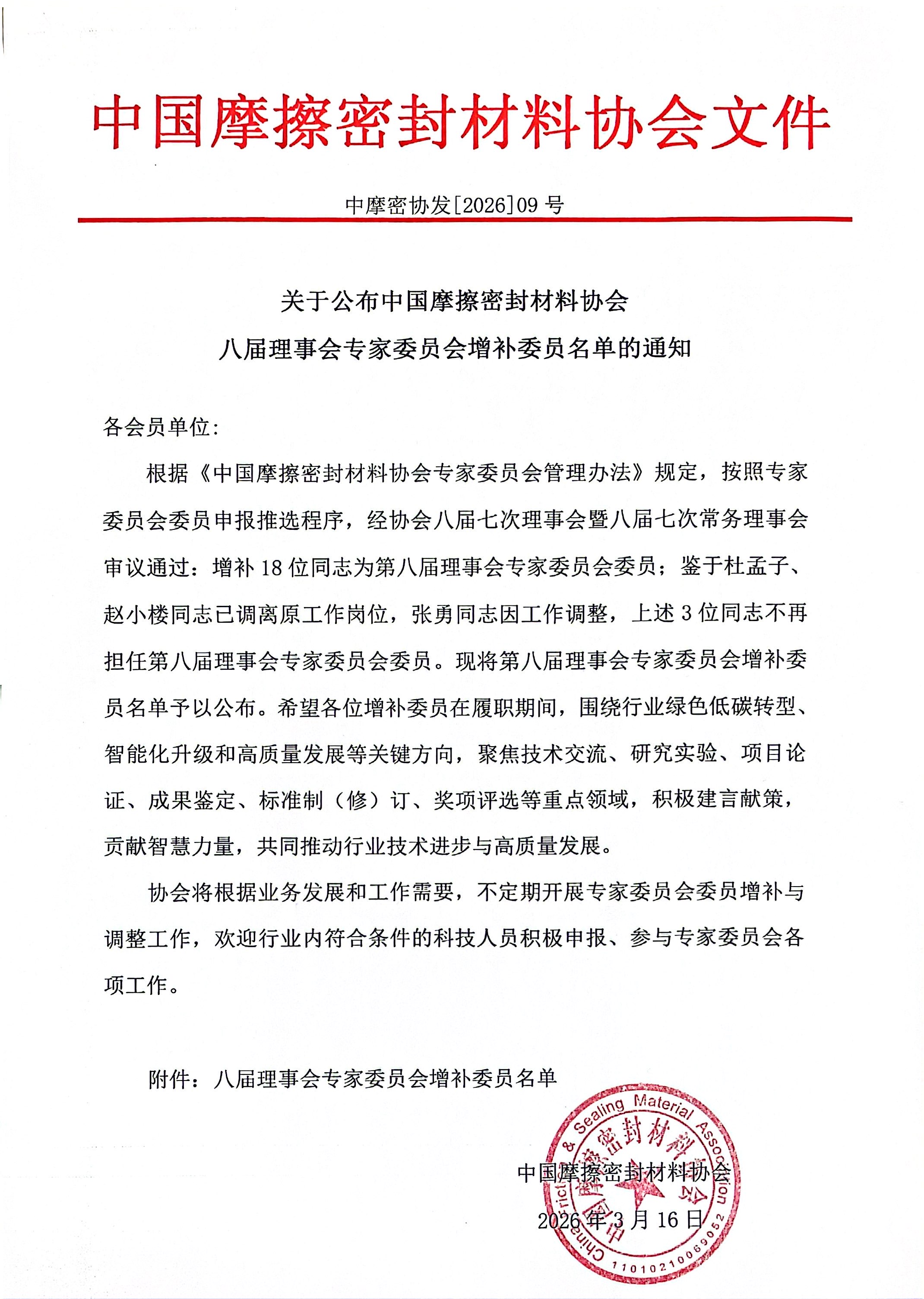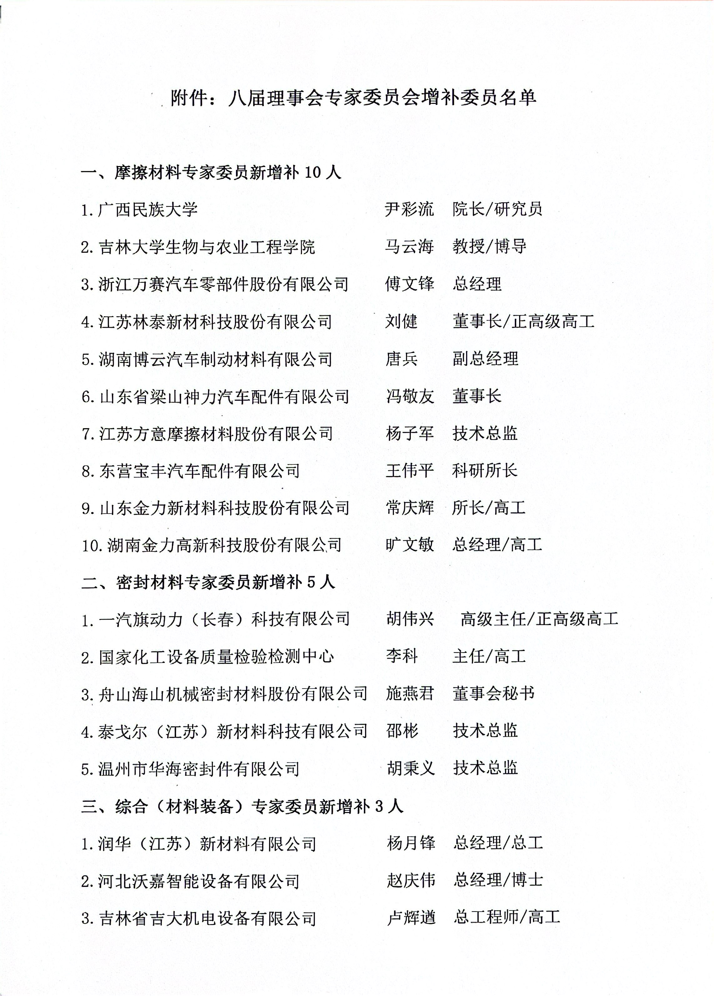 关于公布中国摩擦密封材料协会八届理事会专家委员会增补委员名单的通知